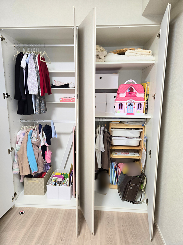 こちらの収納はハンガーかけるには高さがないため、収納ケースを用意し服を畳むレクチャーをして、お洋服もお布団もバッグや小物も全部パッと出せるように。
